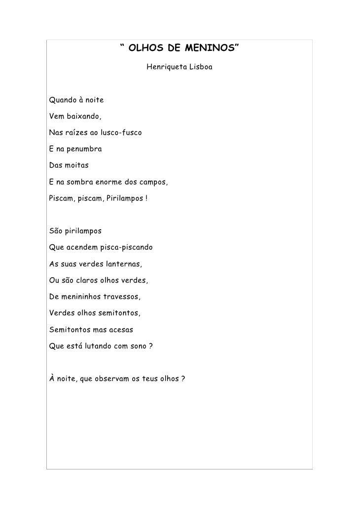 52. 52. “ OLHOS DE MENINOS” Henriqueta Lisboa Quando à noite Vem baixando, Nas raízes ao lusco-fusco E na penumbra Das moitas E na sombra enorme dos campos, Piscam, piscam, Pirilampos ! São pirilampos Que acendem pisca-piscando As suas verdes lanternas, Ou são claros olhos verdes, De menininhos travessos, Verdes olhos semitontos, Semitontos mas acesas Que está lutando com sono ? À noite, que observam os teus olhos ?