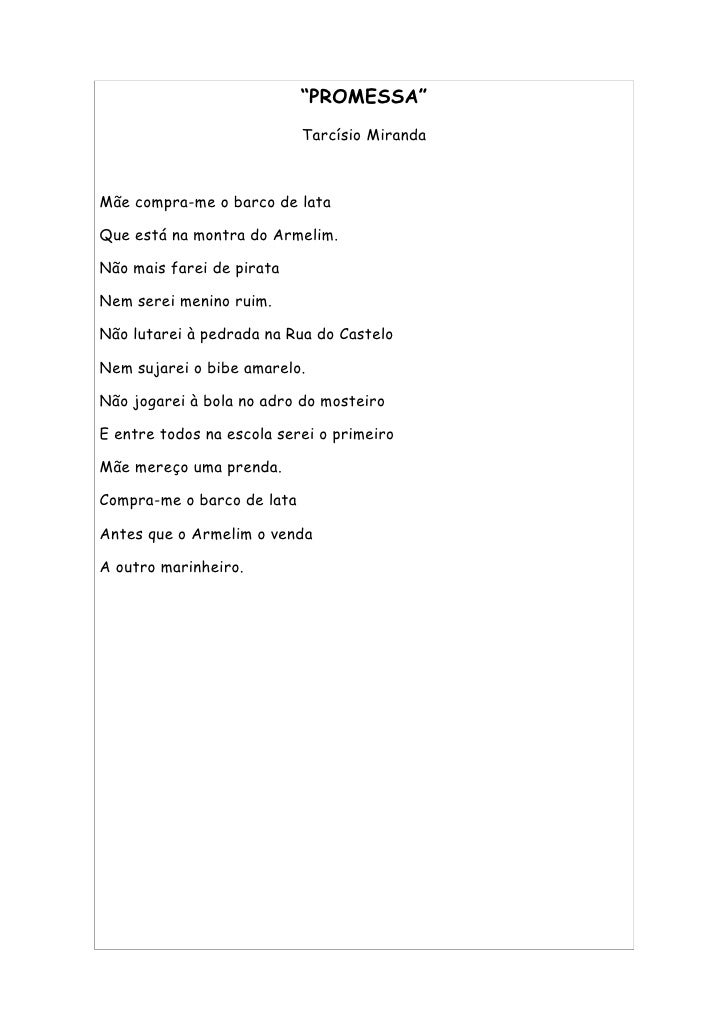 53. 53. “PROMESSA” Tarcísio Miranda Mãe compra-me o barco de lata Que está na montra do Armelim. Não mais farei de pirata Nem serei menino ruim. Não lutarei à pedrada na Rua do Castelo Nem sujarei o bibe amarelo. Não jogarei à bola no adro do mosteiro E entre todos na escola serei o primeiro Mãe mereço uma prenda. Compra-me o barco de lata Antes que o Armelim o venda A outro marinheiro.