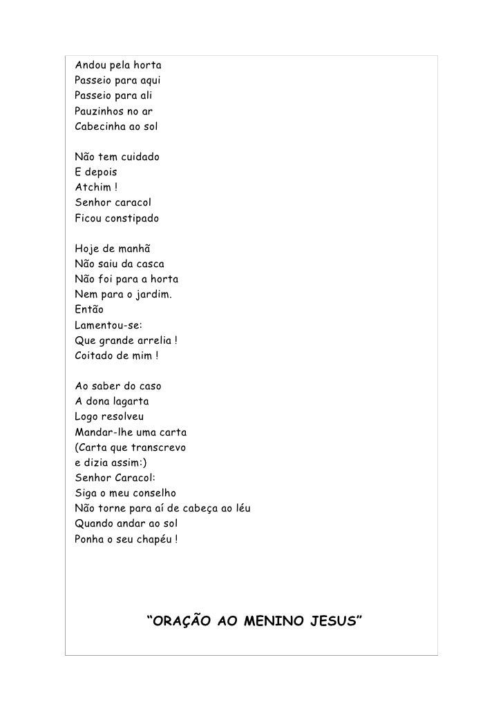 55. 55. Andou pela horta Passeio para aqui Passeio para ali Pauzinhos no ar Cabecinha ao sol Não tem cuidado E depois Atchim ! Senhor caracol Ficou constipado Hoje de manhã Não saiu da casca Não foi para a horta Nem para o jardim. Então Lamentou-se: Que grande arrelia ! Coitado de mim ! Ao saber do caso A dona lagarta Logo resolveu Mandar-lhe uma carta (Carta que transcrevo e dizia assim:) Senhor Caracol: Siga o meu conselho Não torne para aí de cabeça ao léu Quando andar ao sol Ponha o seu chapéu ! “ORAÇÃO AO MENINO JESUS”