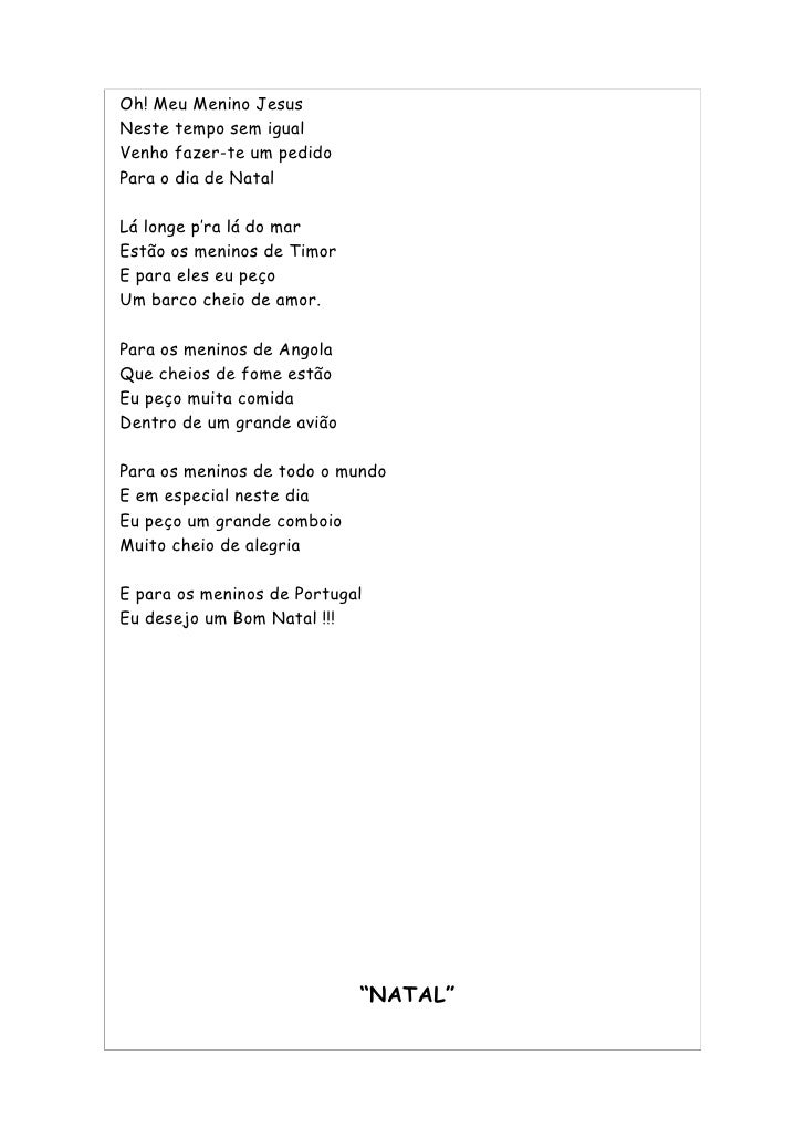 56. 56. Oh! Meu Menino Jesus Neste tempo sem igual Venho fazer-te um pedido Para o dia de Natal Lá longe p’ra lá do mar Estão os meninos de Timor E para eles eu peço Um barco cheio de amor. Para os meninos de Angola Que cheios de fome estão Eu peço muita comida Dentro de um grande avião Para os meninos de todo o mundo E em especial neste dia Eu peço um grande comboio Muito cheio de alegria E para os meninos de Portugal Eu desejo um Bom Natal !!! “NATAL”