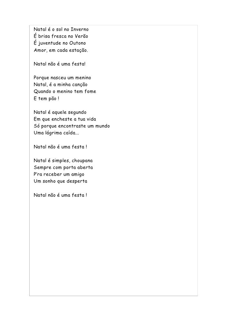 57. 57. Natal é o sol no Inverno É brisa fresca no Verão É juventude no Outono Amor, em cada estação. Natal não é uma festa! Porque nasceu um menino Natal, é a minha canção Quando o menino tem fome E tem pão ! Natal é aquele segundo Em que encheste a tua vida Só porque encontraste um mundo Uma lágrima caída... Natal não é uma festa ! Natal é simples, choupana Sempre com porta aberta P’ra receber um amigo Um sonho que desperta Natal não é uma festa !
