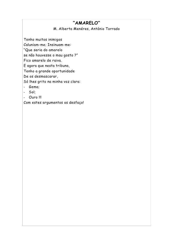 6. 6. “AMARELO” M. Alberta Menéres, António Torrado Tenho muitos inimigos Caluniam-me; Insinuam-me: “Que seria do amarelo se não houvesse o mau gosto ?” Fico amarelo de raiva. E agora que nesta tribuna, Tenho a grande oportunidade De os desmascarar, Só lhes grito na minha voz clara: - Gema; - Sol; - Ouro !!! Com estes argumentos os desfaço!