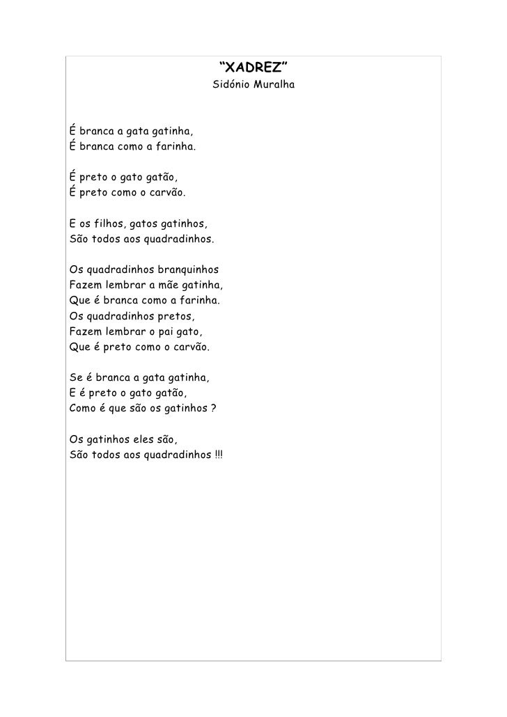 7. 7. “XADREZ” Sidónio Muralha É branca a gata gatinha, É branca como a farinha. É preto o gato gatão, É preto como o carvão. E os filhos, gatos gatinhos, São todos aos quadradinhos. Os quadradinhos branquinhos Fazem lembrar a mãe gatinha, Que é branca como a farinha. Os quadradinhos pretos, Fazem lembrar o pai gato, Que é preto como o carvão. Se é branca a gata gatinha, E é preto o gato gatão, Como é que são os gatinhos ? Os gatinhos eles são, São todos aos quadradinhos !!!