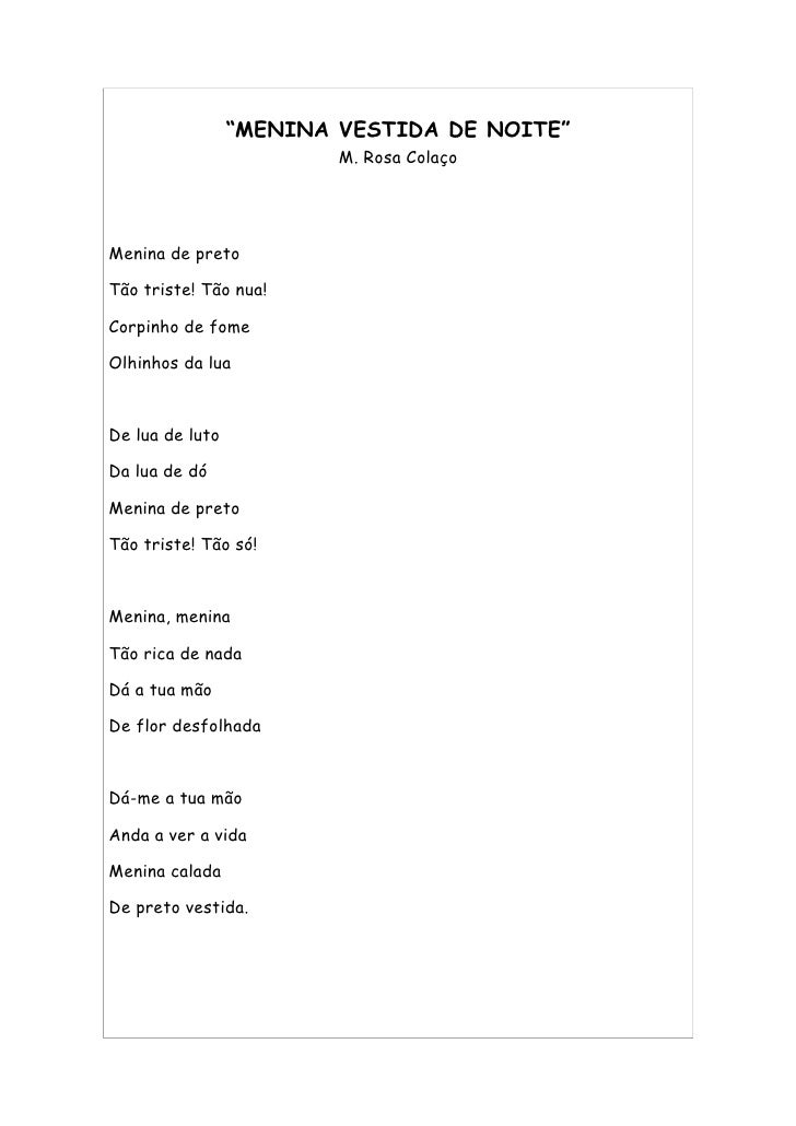 8. 8. “MENINA VESTIDA DE NOITE” M. Rosa Colaço Menina de preto Tão triste! Tão nua! Corpinho de fome Olhinhos da lua De lua de luto Da lua de dó Menina de preto Tão triste! Tão só! Menina, menina Tão rica de nada Dá a tua mão De flor desfolhada Dá-me a tua mão Anda a ver a vida Menina calada De preto vestida.