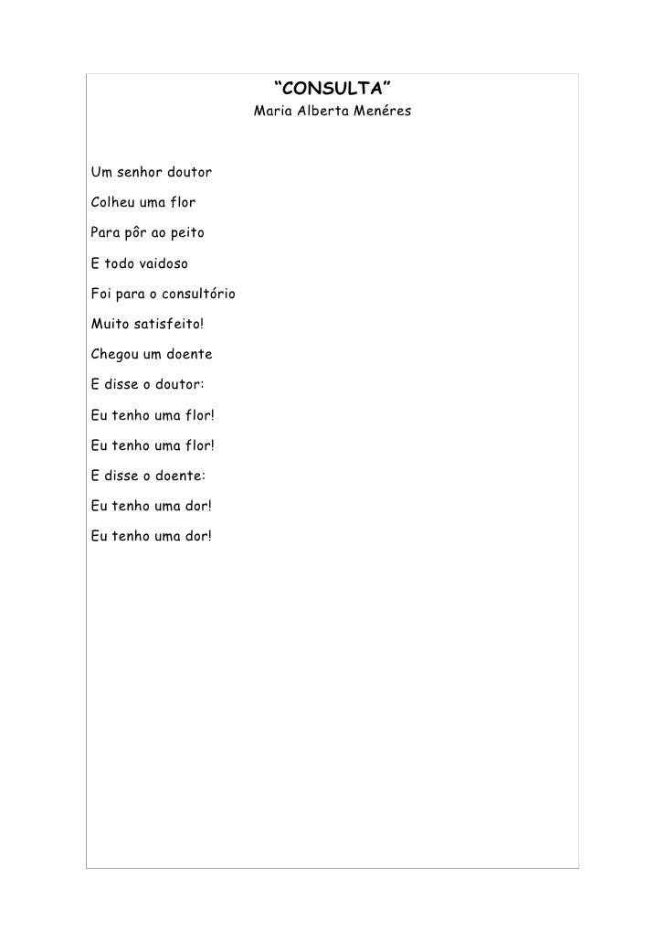 9. 9. “CONSULTA” Maria Alberta Menéres Um senhor doutor Colheu uma flor Para pôr ao peito E todo vaidoso Foi para o consultório Muito satisfeito! Chegou um doente E disse o doutor: Eu tenho uma flor! Eu tenho uma flor! E disse o doente: Eu tenho uma dor! Eu tenho uma dor!