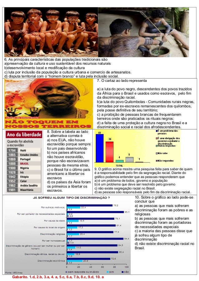 2. 2. 6. As principais características das populações tradicionais são a)preservação da cultura e uso sustentável dos recursos naturais b)desenvolvimento local e modificação da cultura c) luta por inclusão da população a cultura urbana e comercio de artesanatos. d) disputa territorial com o “homem branco” e luta pela inclusão social. 7. O cartaz ao lado representa a) a luta do povo negro, descendentes dos povos trazidos da África para o Brasil e usados como escravos, pelo fim da discriminação racial. b)a luta do povo Quilombolas - Comunidades rurais negras, formadas por ex-escravos remanescentes dos quilombos, pela posse definitiva de seu território; c) a proibição de pessoas brancas de frequentarem terreiros onde são praticados os rituais negros; d) a falta de uma proteção a cultura negra no Brasil e a discriminação social e racial dos afrodescendentes. 8. Sobre a tabela ao lado a alternativa correta é a) nos EUA, não houve escravidão porque sempre foi um pais desenvolvido b) nos países africanos não houve escravidão, porque não escravizavam pessoas da mesma etnia. c) o Brasil foi o último país americano a libertar os escravos d) os países da Ásia foram os primeiros a libertar os escravos. 9. O gráfico acima mostra uma pesquisa feita para saber de quem é a responsabilidade pelo fim da segregação racial. Diante do gráfico podemos entender que as pessoas responderam que a) é um problema de todos, governo e população b) é um problema que deve ser resolvido pelo governo c) não existe segregação racial no Brasil. d) as pessoas são responsáveis pelo fim da discriminação racial. 10. Sobre o gráfico ao lado pode-se concluir que a) as pessoas que mais sofreram discriminação foram as pobres e as religiosas b) as pessoas que mais sofreram discriminação foram as portadoras de necessidades especiais c) a maioria das pessoas disse que já sofreu algum tipo de discriminação d) não existe discriminação racial no Brasil. Gabarito. 1.d, 2.b, 3.a, 4. a, 5.c, 6.a, 7.b, 8.c, 9.d, 10. a