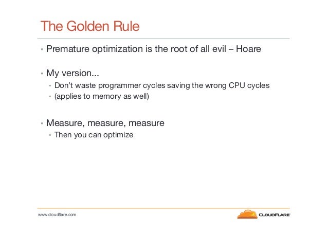 2. 2. The Golden Rule •  Premature optimization is the root of all evil – Hoare •  My version... •  Don’t waste programmer cycles saving the wrong CPU cycles •  (applies to memory as well) •  Measure, measure, measure •  Then you can optimize www.cloudflare.com!