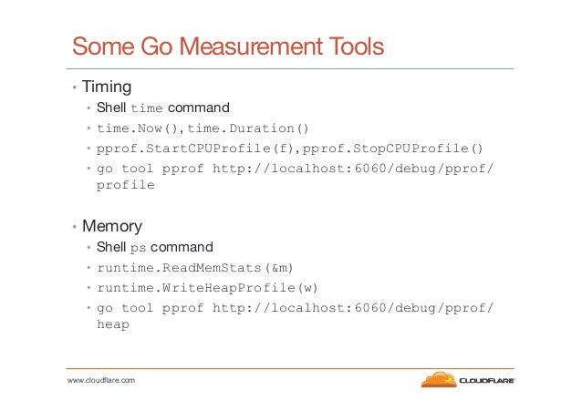 3. 3. Some Go Measurement Tools •  Timing •  Shell time command •  time.Now(), time.Duration() •  pprof.StartCPUProfile(f), pprof.StopCPUProfile() •  go tool pprof http://localhost:6060/debug/pprof/ profile •  Memory •  Shell ps command •  runtime.ReadMemStats(&m) •  runtime.WriteHeapProfile(w) •  go tool pprof http://localhost:6060/debug/pprof/ heap www.cloudflare.com!