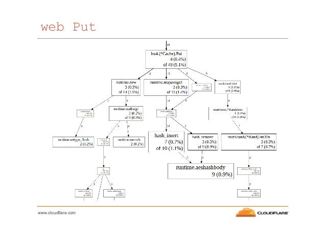 10. 10. pprof command-line % go tool pprof lrutest1 lrutest1.cpuprofile Welcome to pprof! For help, type 'help'. (pprof) top Total: 10440 samples 3826 36.6% 36.6% 3826 36.6% hash_next 2252 21.6% 58.2% 9004 86.2% lru1.(*Cache).makeSpace 2130 20.4% 78.6% 2920 28.0% runtime.mapiter2 623 6.0% 84.6% 623 6.0% runtime.memcopy64 248 2.4% 87.0% 3916 37.5% runtime.mapiternext 242 2.3% 89.3% 777 7.4% strings.genSplit 168 1.6% 90.9% 168 1.6% runtime.strcopy 151 1.4% 92.3% 151 1.4% strings.Count 64 0.6% 93.0% 195 1.9% scanblock 62 0.6% 93.5% 390 3.7% runtime.mallocgc www.cloudflare.com!