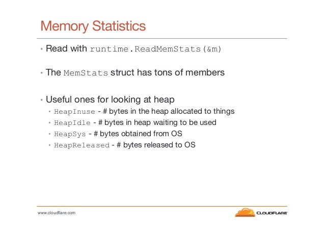 35. 35. Memory Statistics •  Read with runtime.ReadMemStats(&m) •  The MemStats struct has tons of members •  Useful ones for looking at heap •  HeapInuse - # bytes in the heap allocated to things •  HeapIdle - # bytes in heap waiting to be used •  HeapSys - # bytes obtained from OS •  HeapReleased - # bytes released to OS www.cloudflare.com!