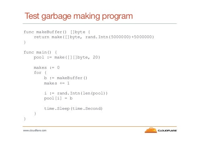 36. 36. Test garbage making program func makeBuffer() []byte { return make([]byte, rand.Intn(5000000)+5000000) } func main() { pool := make([][]byte, 20) makes := 0 for { b := makeBuffer() makes += 1 i := rand.Intn(len(pool)) pool[i] = b time.Sleep(time.Second) } } www.cloudflare.com!