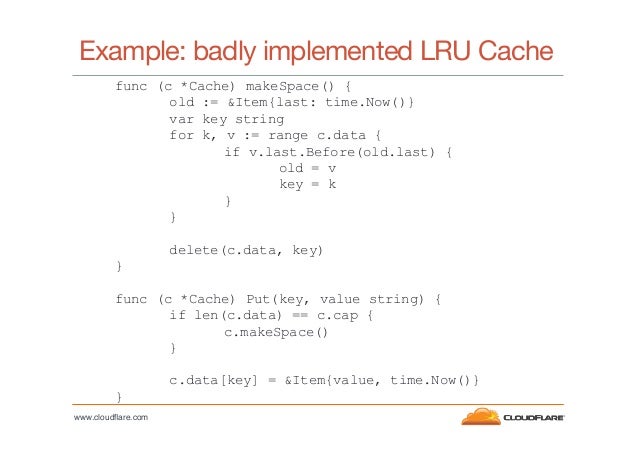6. 6. Example: badly implemented LRU Cache func (c *Cache) makeSpace() { old := &Item{last: time.Now()} var key string for k, v := range c.data { if v.last.Before(old.last) { old = v key = k } } delete(c.data, key) } func (c *Cache) Put(key, value string) { if len(c.data) == c.cap { c.makeSpace() } c.data[key] = &Item{value, time.Now()} } www.cloudflare.com!