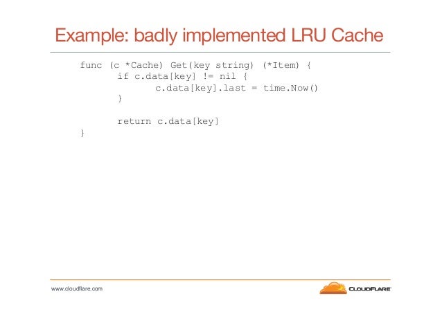 7. 7. Example: badly implemented LRU Cache func (c *Cache) Get(key string) (*Item) { if c.data[key] != nil { c.data[key].last = time.Now() } return c.data[key] } www.cloudflare.com!