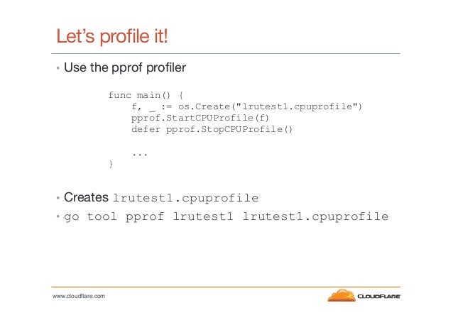 9. 9. Let’s profile it! •  Use the pprof profiler func main() { f, _ := os.Create("lrutest1.cpuprofile") pprof.StartCPUProfile(f) defer pprof.StopCPUProfile() ... } •  Creates lrutest1.cpuprofile •  go tool pprof lrutest1 lrutest1.cpuprofile www.cloudflare.com!