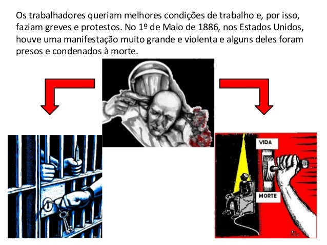 6. 6. Os trabalhadores queriam melhores condições de trabalho e, por isso,faziam greves e protestos. No 1º de Maio de 1886, nos Estados Unidos,houve uma manifestação muito grande e violenta e alguns deles forampresos e condenados à morte.