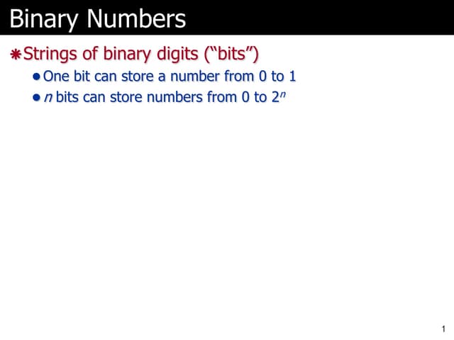 1. 1. Number Systems, Base Conversions, and Computer Data Representation Decimal and Binary Numbers When we write decimal (base 10) numbers, we use a positional notation system. Each digit is multiplied by an appropriate power of 10 depending on its position in the number: For example: 843 = 8 x 102 + 4 x 101 + 3 x 100 = 8 x 100 + 4 x 10 + 3 x 1 = 800 + 40 + 3 For whole numbers, the rightmost digit position is the one’s position (100 = 1). The numeral in that position indicates how many ones are present in the number. The next position to the left is ten’s, then hundred’s, thousand’s, and so on. Each digit position has a weight that is ten times the weight of the position to its right. In the decimal number system, there are ten possible values that can appear in each digit position, and so there are ten numerals required to represent the quantity in each digit position. The decimal numerals are the familiar zero through nine (0, 1, 2, 3, 4, 5, 6, 7, 8, 9). In a positional notation system, the number base is called the radix. Thus, the base ten system that we normally use has a radix of 10. The term radix and base can be used interchangeably. When writing numbers in a radix other than ten, or where the radix isn’t clear from the context, it is customary to specify the radix using a subscript. Thus, in a case where the radix isn’t understood, decimal numbers would be written like this: 12710 1110 567310 Generally, the radix will be understood from the context and the radix specification is left off. The binary number system is also a positional notation numbering system, but in this case, the base is not ten, but is instead two. Each digit position in a binary number represents a power of two. So, when we write a binary number, each binary digit is multiplied by an appropriate power of 2 based on the position in the number: For example: 101101 = 1 x 25 + 0 x 24 + 1 x 23 + 1 x 22 + 0 x 21 + 1 x 20 = 1 x 32 + 0 x 16 + 1 x 8 + 1 x 4 + 0 x 2 + 1 x 1 = 32 + 8 + 4 + 1 In the binary number system, there are only two possible values that can appear in each digit position rather than the ten that can appear in a decimal number. Only the numerals 0 and 1 are used in binary numbers. The term ‘bit’ is a contraction of the words ‘binary’ and ‘digit’, and when talking about binary numbers the terms bit and digit can be used interchangeably. When talking about binary numbers, it is often necessary to talk of the number of bits used to store or represent the number. This merely describes the number of binary digits that would be required to write the number. The number in the above example is a 6 bit number. The following are some additional examples of binary numbers: 1011012 112 101102