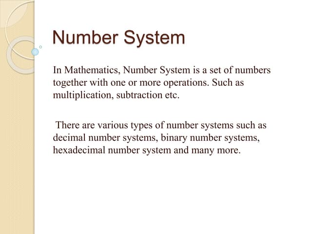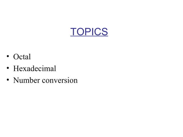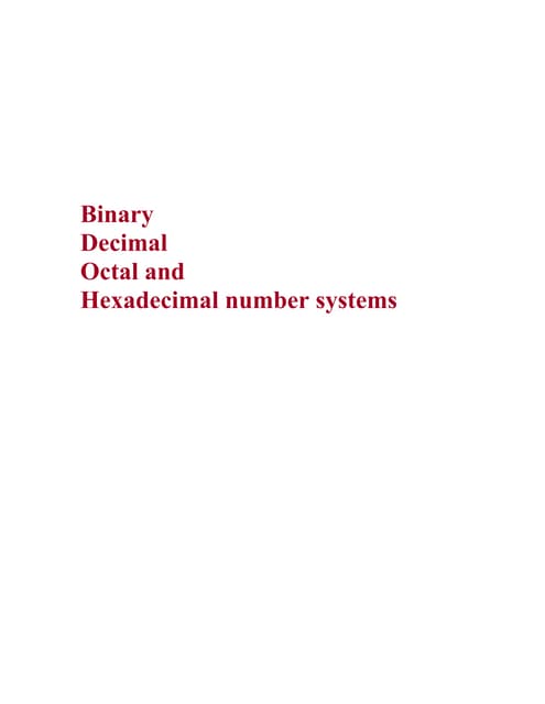 9. 9. EE-314 Number Systems 9 Equivalent Numbers in Decimal, Binary and Hexadecimal Notation: Decimal Binary Hexadecimal 0 00000000 00 1 00000001 01 2 00000010 02 3 00000011 03 4 00000100 04 5 00000101 05 6 00000110 06 7 00000111 07 8 00001000 08 9 00001001 09 10 00001010 0A 11 00001011 0B 12 00001100 0C 13 00001101 0D 14 00001110 0E 15 00001111 0F 16 00010000 10 17 00010001 11 31 00011111 1F 32 00100000 20 63 00111111 3F 64 01000000 40 65 01000001 41 127 01111111 7F 128 10000000 80 129 10000001 81 255 11111111 FF 256 0000000100000000 0100 32767 0111111111111111 7FFF 32768 1000000000000000 8000 65535 1111111111111111 FFFF
