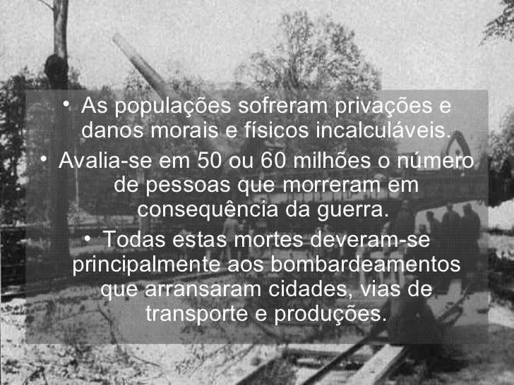 30. 30. <ul><li>As populações sofreram privações e danos morais e físicos incalculáveis. </li></ul><ul><li>Avalia-se em 50 ou 60 milhões o número de pessoas que morreram em consequência da guerra. </li></ul><ul><li>Todas estas mortes deveram-se principalmente aos bombardeamentos que arransaram cidades, vias de transporte e produções. </li></ul>