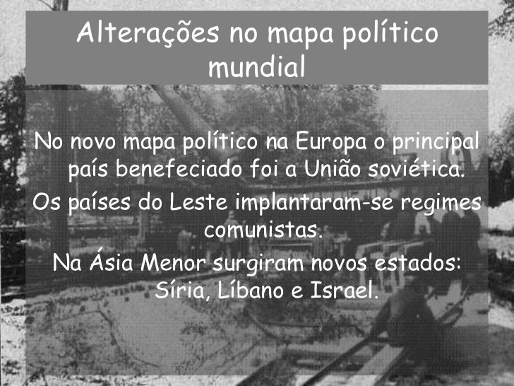 31. 31. Alterações no mapa político mundial <ul><li>No novo mapa político na Europa o principal país benefeciado foi a União soviética. </li></ul><ul><li>Os países do Leste implantaram-se regimes comunistas. </li></ul><ul><li>Na Ásia Menor surgiram novos estados: Síria, Líbano e Israel. </li></ul>