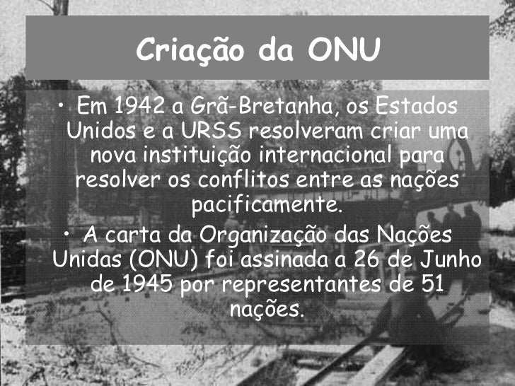 32. 32. Criação da ONU <ul><li>Em 1942 a Grã-Bretanha, os Estados Unidos e a URSS resolveram criar uma nova instituição internacional para resolver os conflitos entre as nações pacificamente. </li></ul><ul><li>A carta da Organização das Nações Unidas (ONU) foi assinada a 26 de Junho de 1945 por representantes de 51 nações. </li></ul>