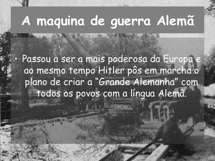 4. 4. <ul><li>Passou a ser a mais poderosa da Europa e ao mesmo tempo Hitler pôs em marcha o plano de criar a “Grande Alemanha” com todos os povos com a língua Alemã. </li></ul>A maquina de guerra Alemã