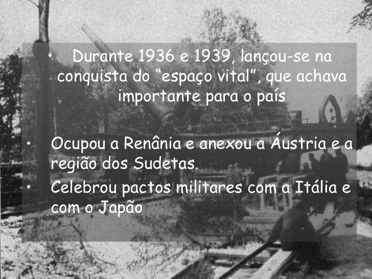 5. 5. <ul><li>Durante 1936 e 1939, lançou-se na conquista do “espaço vital”, que achava importante para o país </li></ul><ul><li>Ocupou a Renânia e anexou a Áustria e a região dos Sudetas. </li></ul><ul><li>Celebrou pactos militares com a Itália e com o Japão </li></ul>