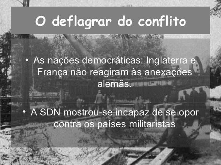 6. 6. O deflagrar do conflito <ul><li>As nações democráticas: Inglaterra e França não reagiram às anexações alemãs. </li></ul><ul><li>A SDN mostrou-se incapaz de se opor contra os países militaristas </li></ul>