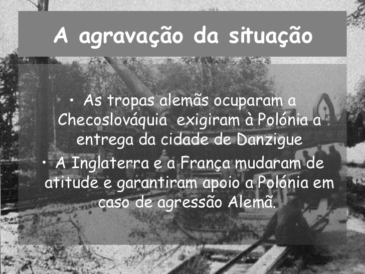 7. 7. A agravação da situação <ul><li>As tropas alemãs ocuparam a Checoslováquia exigiram à Polónia a entrega da cidade de Danzigue </li></ul><ul><li>A Inglaterra e a França mudaram de atitude e garantiram apoio a Polónia em caso de agressão Alemã. </li></ul>