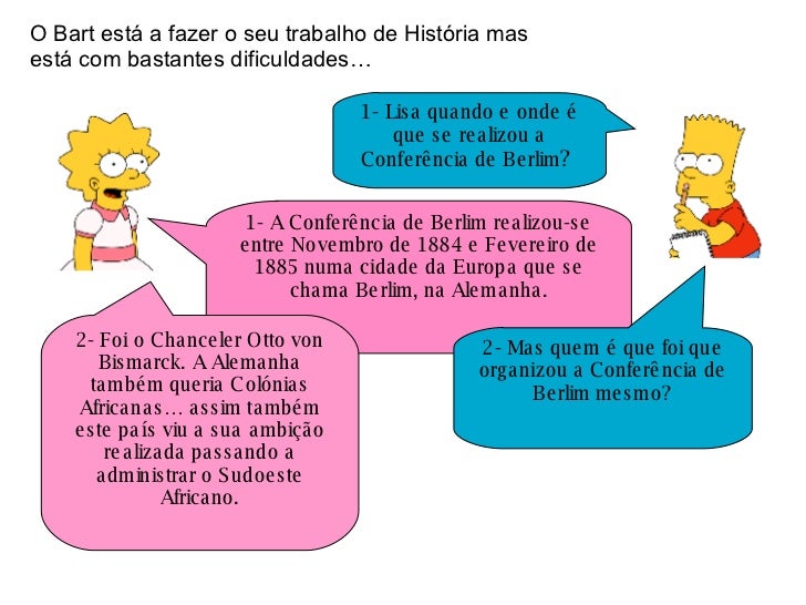 2. 2. 1- Lisa quando e onde é que se realizou a Conferência de Berlim ? 1- A Conferência de Berlim realizou-se entre Novembro de 1884 e Fevereiro de 1885 numa cidade da Europa que se chama Berlim, na Alemanha. O Bart está a fazer o seu trabalho de História mas está com bastantes dificuldades… 2- Mas quem é que foi que organizou a Conferência de Berlim mesmo? 2- Foi o Chanceler Otto von Bismarck. A Alemanha também queria Colónias Africanas… assim também este país viu a sua ambição realizada passando a administrar o Sudoeste Africano.
