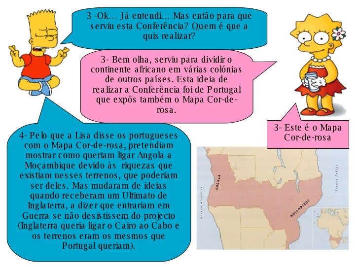3. 3. 3 -Ok… Já entendi… Mas então para que serviu esta Conferência? Quem é que a quis realizar? 3- Bem olha, serviu para dividir o continente africano em várias colónias de outros países. Esta ideia de realizar a Conferência foi de Portugal que expôs também o Mapa Cor-de-rosa. 3- Este é o Mapa Cor-de-rosa 4- Pelo que a Lisa disse os portugueses com o Mapa Cor-de-rosa, pretendiam mostrar como queriam ligar Angola a Moçambique devido às riquezas que existiam nesses terrenos, que poderiam ser deles. Mas mudaram de ideias quando receberam um Ultimato de Inglaterra, a dizer que entrariam em Guerra se não desistissem do projecto (Inglaterra queria ligar o Cairo ao Cabo e os terrenos eram os mesmos que Portugal queriam).