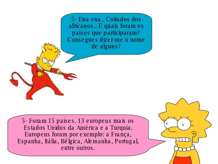 4. 4. 5- Ena ena.. Coitados dos africanos.. E quais foram os países que participaram? Consegues dizer-me o nome de alguns? 5- Foram 15 países. 13 europeus mais os Estados Unidos da América e a Turquia. Europeus foram por exemplo: a França, Espanha, Itália, Bélgica, Alemanha, Portugal, entre outros.