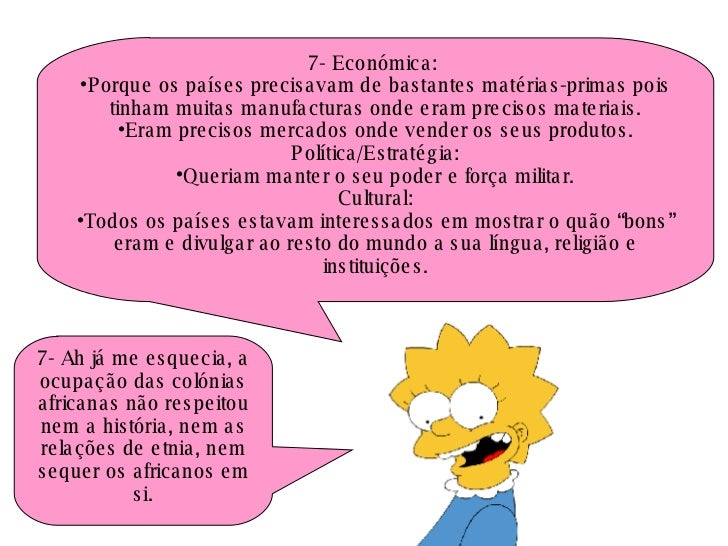 <ul><li>7- Económica:  </li></ul><ul><li>Porque os países precisavam de bastantes matérias-primas pois tinham muitas manuf...