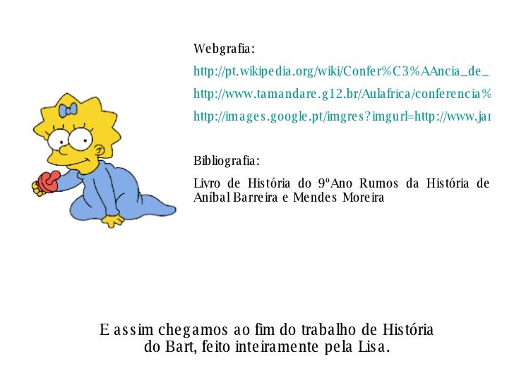 7. 7. E assim chegamos ao fim do trabalho de História do Bart, feito inteiramente pela Lisa. Webgrafia: http://pt.wikipedia.org/wiki/Confer%C3%AAncia_de_Berlim http://www.tamandare.g12.br/Aulafrica/conferencia%20de%20berlim.htm http://images.google.pt/imgres?imgurl=http://www.janusonline.pt/popups9900/9900_1_25_graf_a.jpg&imgrefurl=http://cvhgp3.wordpress.com/category/monarquia/& Bibliografia: Livro de História do 9ºAno Rumos da História de Aníbal Barreira e Mendes Moreira