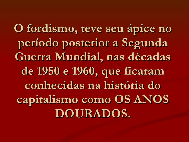 5. 7. O fordismo, teve seu ápice no período posterior a Segunda Guerra Mundial, nas décadas de 1950 e 1960, que ficaram conhecidas na história do capitalismo como OS ANOS DOURADOS.