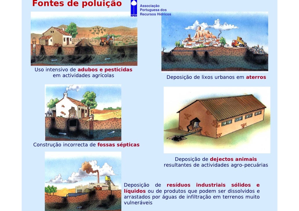 10. 10. Fontes de poluição Associação Portuguesa dos Recursos Hídricos Uso intensivo de adubos e pesticidas em actividades agrícolas Deposição de lixos urbanos em aterros Construção incorrecta de fossas sépticas Deposição de dejectos animais resultantes de actividades agro-pecuárias Deposição de resíduos industriais sólidos e líquidos ou de produtos que podem ser dissolvidos e arrastados por águas de infiltração em terrenos muito vulneráveis