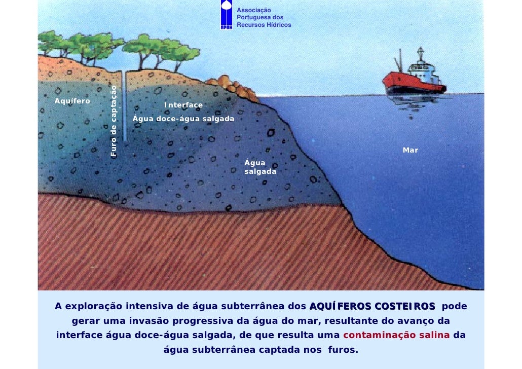 11. 11. Associação Portuguesa dos Recursos Hídricos Furo de captação Aquífero Interface Água doce-água salgada Mar Água salgada A exploração intensiva de água subterrânea dos AQUÍFEROS COSTEIROS pode gerar uma invasão progressiva da água do mar, resultante do avanço da interface água doce-água salgada, de que resulta uma contaminação salina da água subterrânea captada nos furos.