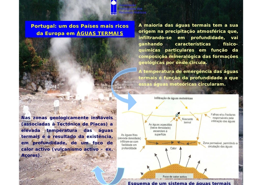 12. 12. Associação Portuguesa dos Recursos Hídricos Portugal: um dos Países mais ricos A maioria das águas termais tem a sua da Europa em ÁGUAS TERMAIS origem na precipitação atmosférica que, infiltrando-se em profundidade, vai ganhando características físico- químicas particulares em função da composição mineralógica das formações geológicas por onde circula. A temperatura de emergência das águas termais é função da profundidade a que essas águas meteóricas circularam. Nas zonas geologicamente instáveis (associadas à Tectónica de Placas) a elevada temperatura das águas termais é o resultado da existência, em profundidade, de um foco de calor activo (vulcanismo activo – ex. Açores).