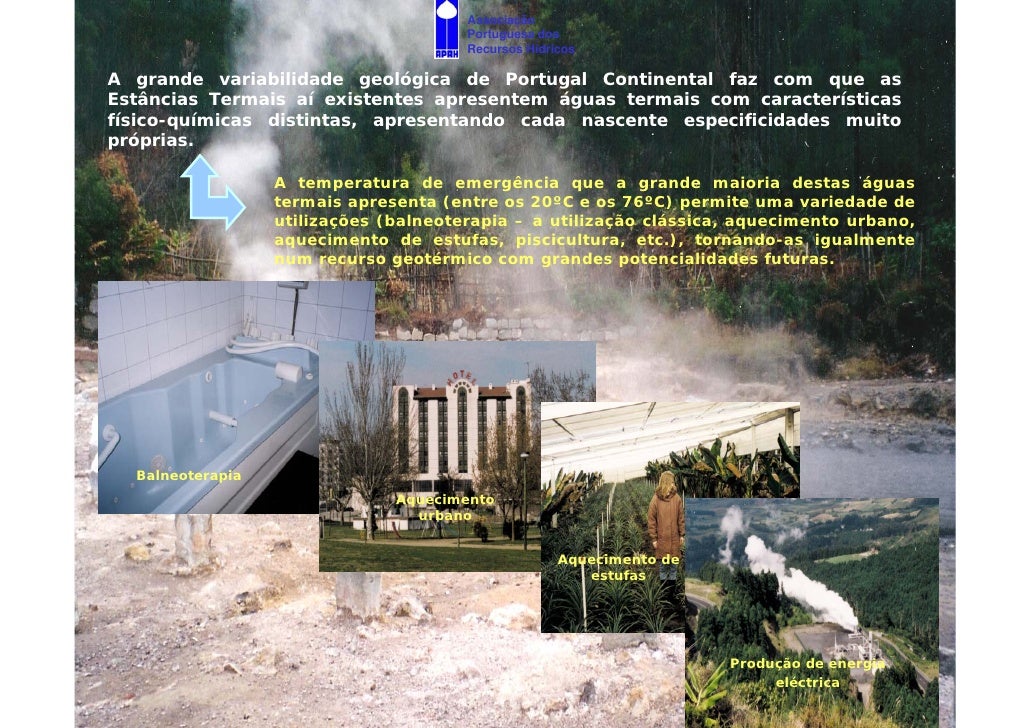 13. 13. Associação Portuguesa dos Recursos Hídricos A grande variabilidade geológica de Portugal Continental faz com que as Estâncias Termais aí existentes apresentem águas termais com características físico-químicas distintas, apresentando cada nascente especificidades muito próprias. A temperatura de emergência que a grande maioria destas águas termais apresenta (entre os 20ºC e os 76ºC) permite uma variedade de utilizações (balneoterapia – a utilização clássica, aquecimento urbano, aquecimento de estufas, piscicultura, etc.), tornando-as igualmente num recurso geotérmico com grandes potencialidades futuras. Balneoterapia Aquecimento urbano Aquecimento de estufas Produção de energia eléctrica
