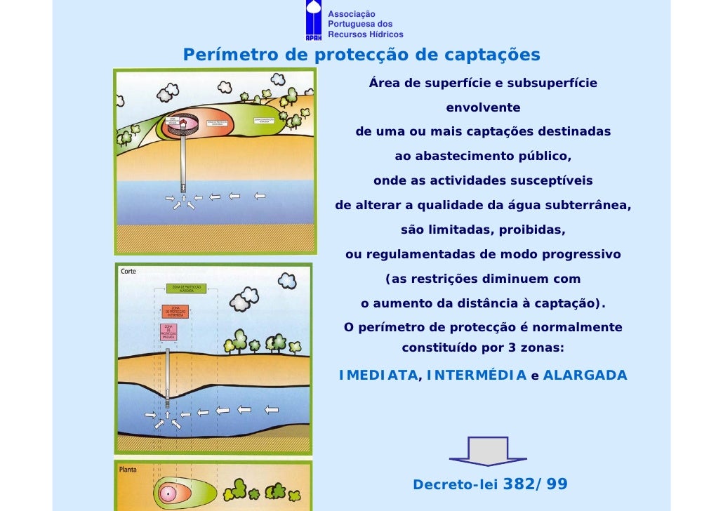 14. 14. Associação Portuguesa dos Recursos Hídricos Perímetro de protecção de captações Área de superfície e subsuperfície envolvente de uma ou mais captações destinadas ao abastecimento público, onde as actividades susceptíveis de alterar a qualidade da água subterrânea, são limitadas, proibidas, ou regulamentadas de modo progressivo (as restrições diminuem com o aumento da distância à captação). O perímetro de protecção é normalmente constituído por 3 zonas: IMEDIATA, INTERMÉDIA e ALARGADA Decreto-lei 382/99