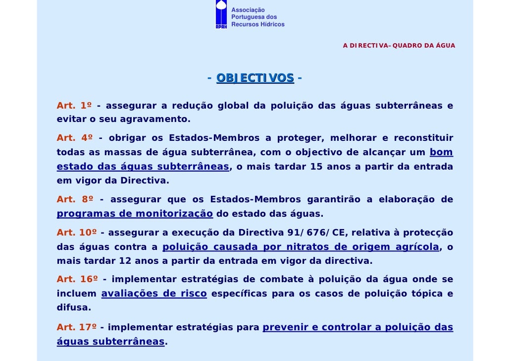 16. 16. Associação Portuguesa dos Recursos Hídricos A DIRECTIVA–QUADRO DA ÁGUA - OBJECTIVOS - Art. 1º - assegurar a redução global da poluição das águas subterrâneas e evitar o seu agravamento. Art. 4º - obrigar os Estados-Membros a proteger, melhorar e reconstituir todas as massas de água subterrânea, com o objectivo de alcançar um bom estado das águas subterrâneas, o mais tardar 15 anos a partir da entrada em vigor da Directiva. Art. 8º - assegurar que os Estados-Membros garantirão a elaboração de programas de monitorização do estado das águas. Art. 10º - assegurar a execução da Directiva 91/676/CE, relativa à protecção das águas contra a poluição causada por nitratos de origem agrícola, o mais tardar 12 anos a partir da entrada em vigor da directiva. Art. 16º - implementar estratégias de combate à poluição da água onde se incluem avaliações de risco específicas para os casos de poluição tópica e difusa. Art. 17º - implementar estratégias para prevenir e controlar a poluição das águas subterrâneas.