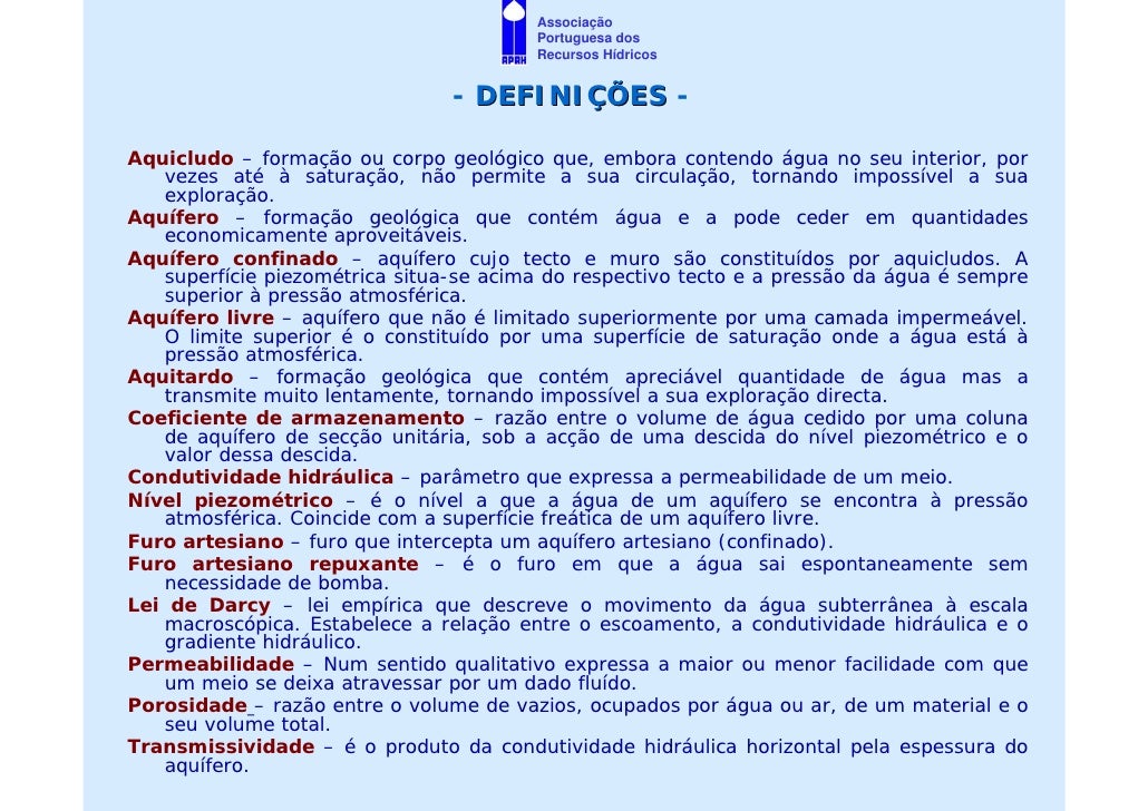 18. 18. Associação Portuguesa dos Recursos Hídricos - DEFINIÇÕES - Aquicludo – formação ou corpo geológico que, embora contendo água no seu interior, por vezes até à saturação, não permite a sua circulação, tornando impossível a sua exploração. Aquífero – formação geológica que contém água e a pode ceder em quantidades economicamente aproveitáveis. Aquífero confinado – aquífero cujo tecto e muro são constituídos por aquicludos. A superfície piezométrica situa-se acima do respectivo tecto e a pressão da água é sempre superior à pressão atmosférica. Aquífero livre – aquífero que não é limitado superiormente por uma camada impermeável. O limite superior é o constituído por uma superfície de saturação onde a água está à pressão atmosférica. Aquitardo – formação geológica que contém apreciável quantidade de água mas a transmite muito lentamente, tornando impossível a sua exploração directa. Coeficiente de armazenamento – razão entre o volume de água cedido por uma coluna de aquífero de secção unitária, sob a acção de uma descida do nível piezométrico e o valor dessa descida. Condutividade hidráulica – parâmetro que expressa a permeabilidade de um meio. Nível piezométrico – é o nível a que a água de um aquífero se encontra à pressão atmosférica. Coincide com a superfície freática de um aquífero livre. Furo artesiano – furo que intercepta um aquífero artesiano (confinado). Furo artesiano repuxante – é o furo em que a água sai espontaneamente sem necessidade de bomba. Lei de Darcy – lei empírica que descreve o movimento da água subterrânea à escala macroscópica. Estabelece a relação entre o escoamento, a condutividade hidráulica e o gradiente hidráulico. Permeabilidade – Num sentido qualitativo expressa a maior ou menor facilidade com que um meio se deixa atravessar por um dado fluído. Porosidade – razão entre o volume de vazios, ocupados por água ou ar, de um material e o seu volume total. Transmissividade – é o produto da condutividade hidráulica horizontal pela espessura do aquífero.