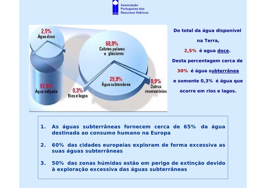 2. 2. Associação Portuguesa dos Recursos Hídricos Do total da água disponível na Terra, 2,5% é agua doce. Desta percentagem cerca de 30% é água subterrânea e somente 0,3% é água que ocorre em rios e lagos. 1. As águas subterrâneas fornecem cerca de 65% da água destinada ao consumo humano na Europa 2. 60% das cidades europeias exploram de forma excessiva as suas águas subterrâneas 3. 50% das zonas húmidas estão em perigo de extinção devido à exploração excessiva das águas subterrâneas