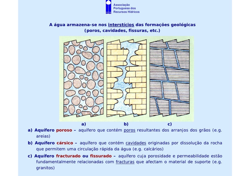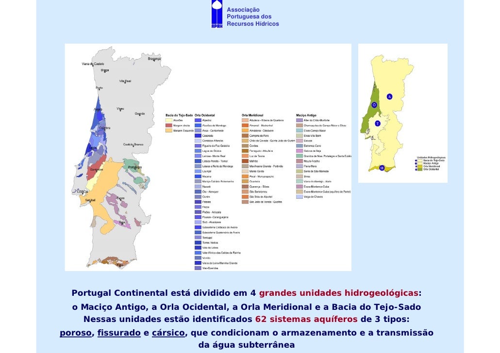 5. 5. Associação Portuguesa dos Recursos Hídricos Portugal Continental está dividido em 4 grandes unidades hidrogeológicas: o Maciço Antigo, a Orla Ocidental, a Orla Meridional e a Bacia do Tejo-Sado Nessas unidades estão identificados 62 sistemas aquíferos de 3 tipos: poroso, fissurado e cársico, que condicionam o armazenamento e a transmissão da água subterrânea