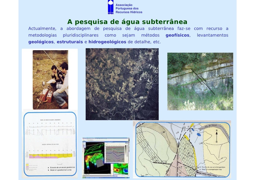 7. 7. Associação Portuguesa dos Recursos Hídricos A pesquisa de água subterrânea Actualmente, a abordagem de pesquisa de água subterrânea faz-se com recurso a metodologias pluridisciplinares como sejam métodos geofísicos, levantamentos geológicos, estruturais e hidrogeológicos de detalhe, etc.