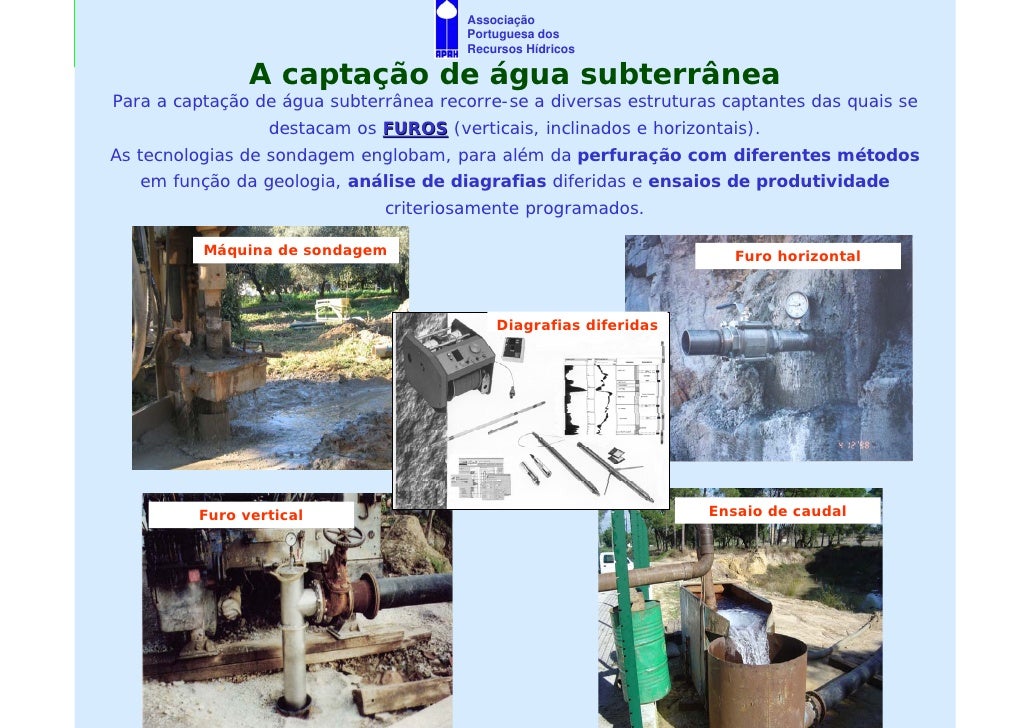 8. 8. Associação Portuguesa dos Recursos Hídricos A captação de água subterrânea Para a captação de água subterrânea recorre-se a diversas estruturas captantes das quais se destacam os FUROS (verticais, inclinados e horizontais). As tecnologias de sondagem englobam, para além da perfuração com diferentes métodos em função da geologia, análise de diagrafias diferidas e ensaios de produtividade criteriosamente programados. Máquina de sondagem Furo horizontal Diagrafias diferidas Furo vertical Ensaio de caudal