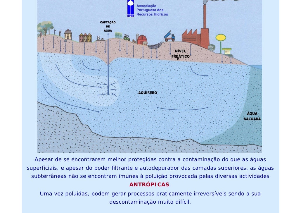 9. 9. Associação Portuguesa dos Recursos Hídricos Apesar de se encontrarem melhor protegidas contra a contaminação do que as águas superficiais, e apesar do poder filtrante e autodepurador das camadas superiores, as águas subterrâneas não se encontram imunes à poluição provocada pelas diversas actividades ANTRÓPICAS. Uma vez poluídas, podem gerar processos praticamente irreversíveis sendo a sua descontaminação muito difícil.