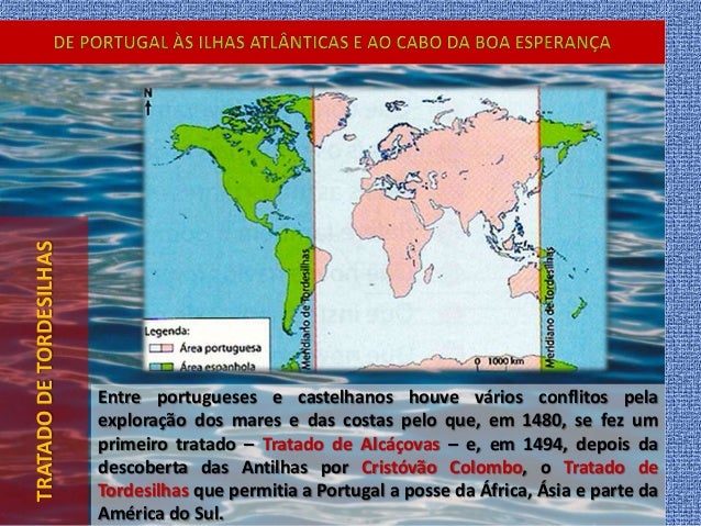 12. 12. TRATADODETORDESILHAS Entre portugueses e castelhanos houve vários conflitos pela exploração dos mares e das costas pelo que, em 1480, se fez um primeiro tratado – Tratado de Alcáçovas – e, em 1494, depois da descoberta das Antilhas por Cristóvão Colombo, o Tratado de Tordesilhas que permitia a Portugal a posse da África, Ásia e parte da América do Sul.