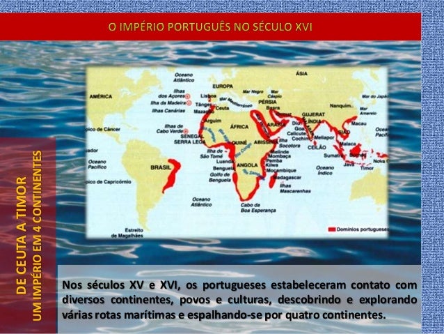 15. 15. DECEUTAATIMOR UMIMPÉRIOEM4CONTINENTES Nos séculos XV e XVI, os portugueses estabeleceram contato com diversos continentes, povos e culturas, descobrindo e explorando várias rotas marítimas e espalhando-se por quatro continentes.