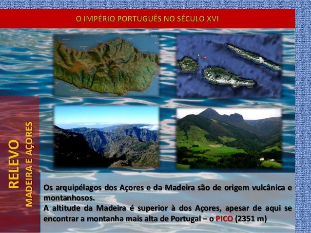 17. 17. RELEVO MADEIRAEAÇORES Os arquipélagos dos Açores e da Madeira são de origem vulcânica e montanhosos. A altitude da Madeira é superior à dos Açores, apesar de aqui se encontrar a montanha mais alta de Portugal – o PICO (2351 m)