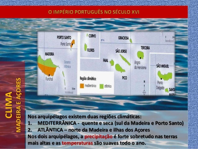 19. 19. CLIMA MADEIRAEAÇORES Nos arquipélagos existem duas regiões climáticas: 1. MEDITERRÂNICA - quente e seca (sul da Madeira e Porto Santo) 2. ATLÂNTICA – norte da Madeira e ilhas dos Açores Nos dois arquipélagos, a precipitação é forte sobretudo nas terras mais altas e as temperaturas são suaves todo o ano.